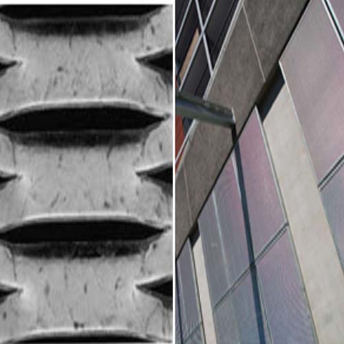 The ‘Dragon scale’ profile (above), is an elegant example of what can be achieved when we work closely with the designer in order to come up with something beautiful and functional. Dragon scale achieves a textural facade with a high open area, while still restricting vision. The privacy of inhabitants is ensured as the light is reflected upward....